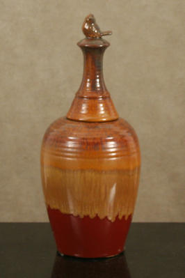 Red And Tan Vase With Bird Lid